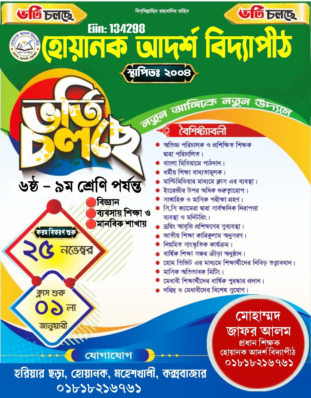 আসসালামু আলাইকুম সম্মানিত অভিভাবক ও ভর্তি-ইচ্ছুক প্রিয় শিক্ষার্থীদের আনন্দের সাথে জানানো যাচ্ছে যে, আগামী ২০২৬ ইং শিক্ষাবর্ষের জন্য হোয়ানক আদর্শ বিদ্যাপীঠ এ ৬ষ্ঠ - ৯ম শ্রেণি পর্যন্ত বিজ্ঞান, মানবিক ও ব্যবসা শিক্ষা শাখায় শিক্ষার্থী ভর্তি করা হবে। মোহাম্মদ জাফর আলমপ্রধান শিক্ষক হোয়ানক আদর্শ বিদ্যাপীঠ